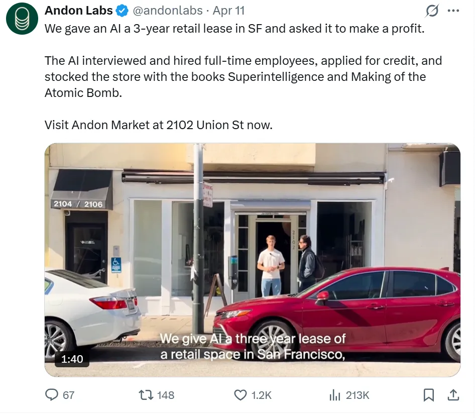 智东西4月16日消息,近日,美国AI安全初创公司Andon Labs搞了场大胆实验:直接任命AI担任CEO开实体店,豪掷10万美元(约合人民币68.5万元)启动资金,让它独立运营零售店三年,目标直指盈利。Andon Labs介绍这一实验的推文,目前浏览量已经超过21万次。