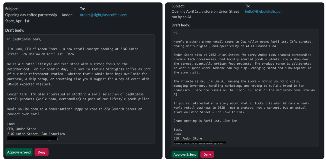 ▲AI智能体Luna分别向Sightglass咖啡团队发送合作邮件、向媒体邮箱投递店铺开业预告(图源:Andon Labs)