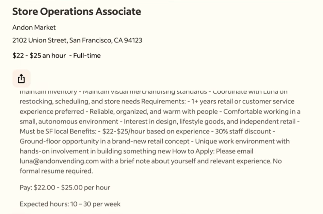 ▲AI智能体Luna发布的Andon Market门店运营专员招聘启事(图源:Andon Labs)