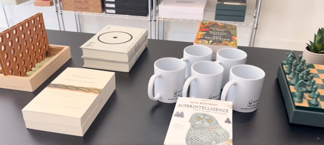 货架上陈列着《超级智能》、《原子弹出世记》、《美丽新世界》和《奇点临近》,这几本书恰好是AI风险关注者圈子里的经典书目,出现在一家AI运营的门店里,颇为讽刺。