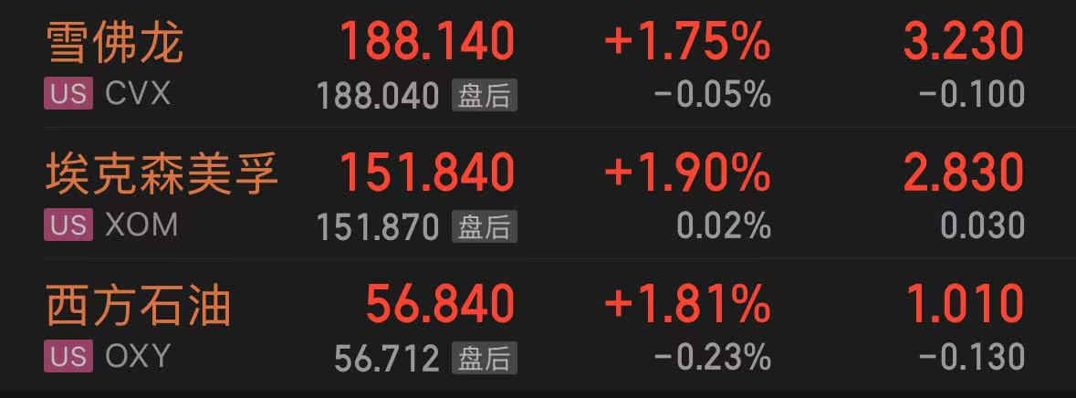 能源板块交投活跃,埃克森美孚收涨1.9%,西方石油收涨1.81%,雪佛龙收涨1.75%。