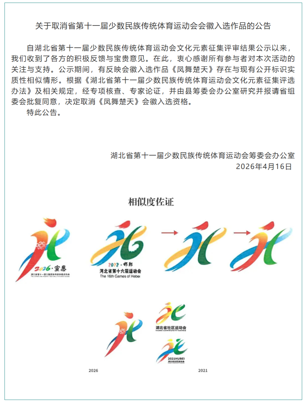 4月16日,湖北省第十一届少数民族传统体育运动会筹委会办公室通过湖北恩施宣恩县“宣恩发布”微信公众号发布了《关于取消省第十一届少数民族传统体育运动会会徽入选作品的公告》(简称《公告》)。