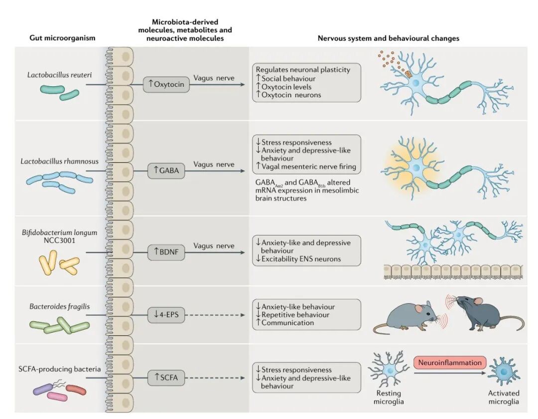 神经通路是肠道与大脑之间的物理连接,其中最主要的是迷走神经,该神经从脑干延伸至肠道,支配肠道和肠神经系统(ENS)。肠神经系统的发育和功能部分由肠道微生物群介导,但这一领域的研究仍相对匮乏。无菌小鼠结肠上皮的神经支配减少,而微生物定植可恢复这一表型;此外,肠道微生物群还能调节小鼠肠神经胶质细胞的发育,这类细胞对维持肠道稳态和神经元网络至关重要。