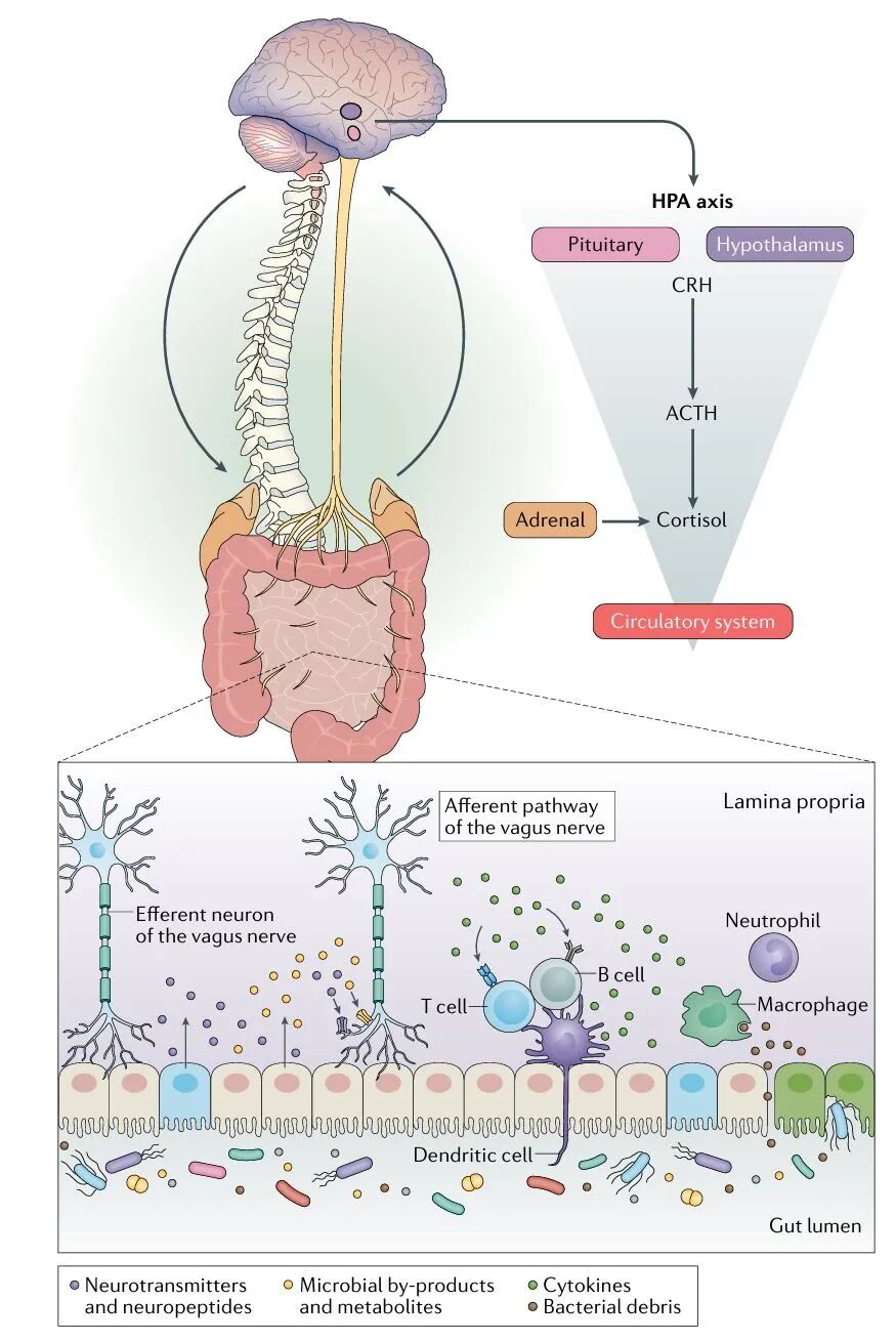 肠道微生物群可通过与神经系统的化学交流(包括 “直接” 和 “间接” 信号传导,帮助调节宿主动物的稳态和行为。