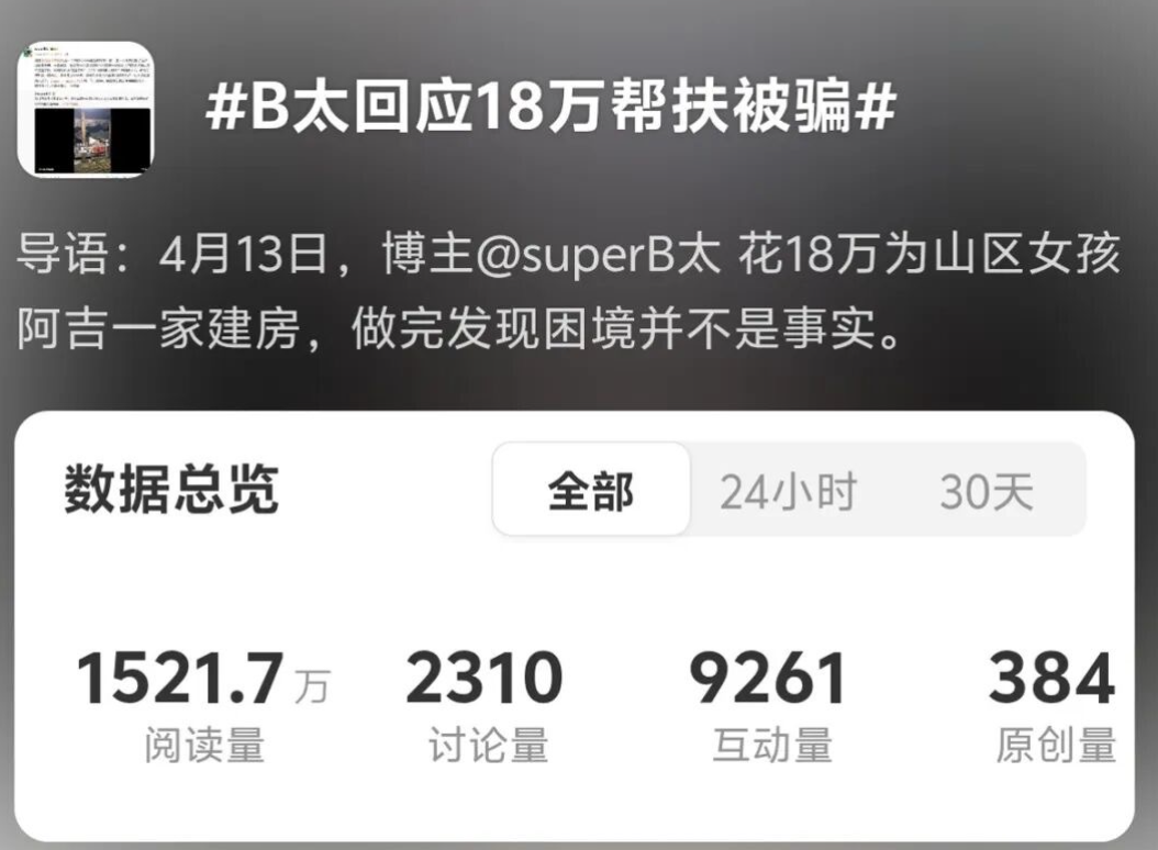 4月13日,百万粉丝博主B太发视频称,花18万为山区女孩阿吉一家建房,完成后发现他们的困境并不是事实,相关话题登上热搜。