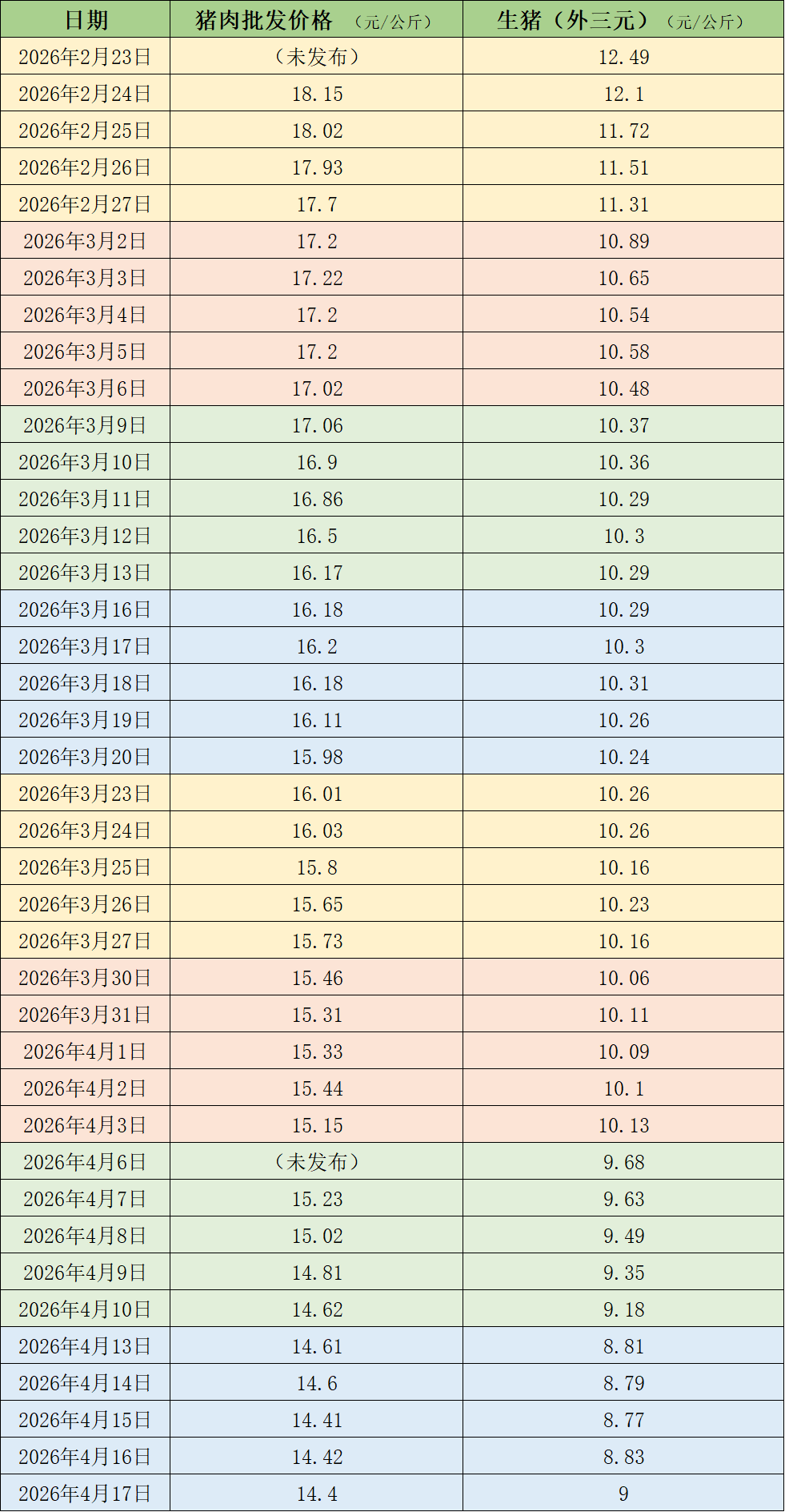 据国家统计局数据,2026年3月下旬生猪(外三元)价格为9.5元/公斤,4月上旬价格为9.1元/公斤,生猪(外三元)价格连续创(至少)近12年的新低。
