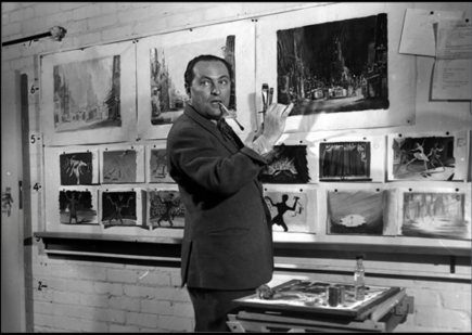 站在《红菱艳》概念草图前的海因·赫克罗斯手里拿着(嘴里也咬着)笔刷