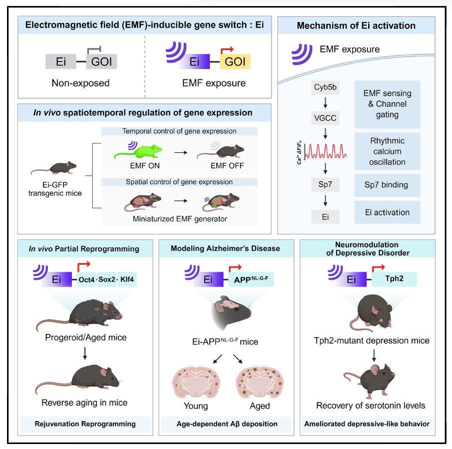 该研究成功研发电磁场诱导型体内基因开关(Ei),以Cyb5b为电磁场感受器,通过节律性钙离子振荡实现基因表达的无创、时空精准调控,最优参数为2.0 mT、60 Hz电磁场;该系统可驱动Ei-OSK实现体内衰老表型逆转、构建阿尔茨海默病精准模型、恢复5 -羟色胺合成改善抑郁行为,具备高生物相容性与临床转化潜力。