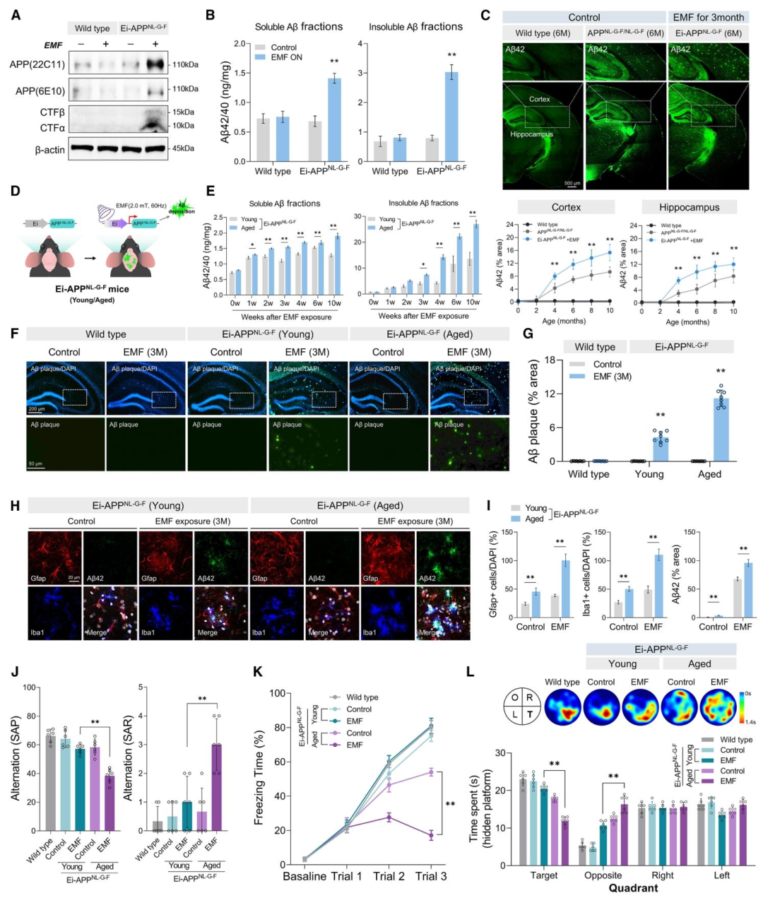 随后,作者研究年龄对 β 淀粉样蛋白(Aβ)产生的影响,给年轻(3月龄)和老年(20 个月)的Ei-APP 突变小鼠施加电磁场。