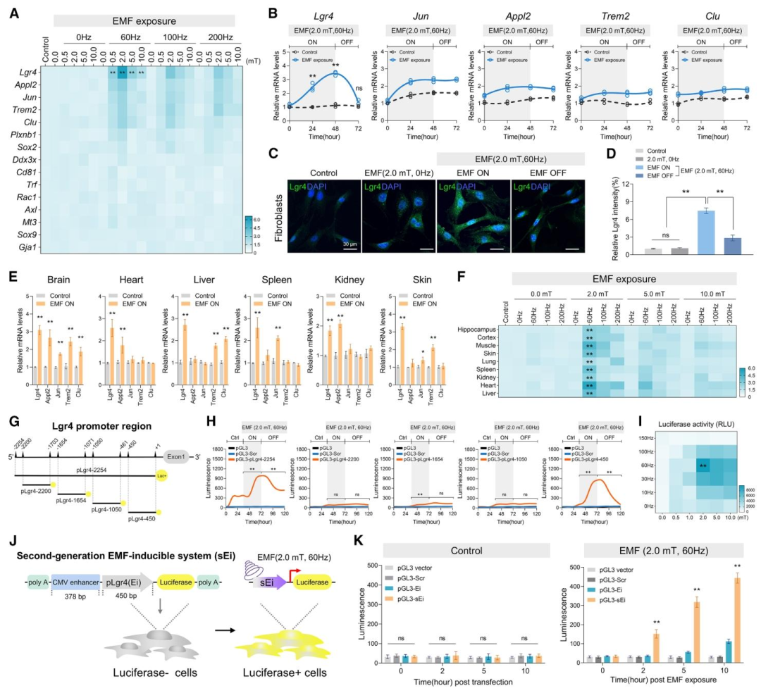 作者先在小鼠大脑里筛选,发现Lgr4 基因只在2.0 mT、60 Hz的特定电磁场下被激活,开关灵敏、可关闭、无背景泄露。接着找到 Lgr4 上450bp 的关键片段(Ei),成功做出电磁场基因开关;还做出升级版sEi,2 小时就能快速启动。最终证明这套系统稳定、特异、安全,不激活致癌通路,是理想的无创时空精准基因调控工具。