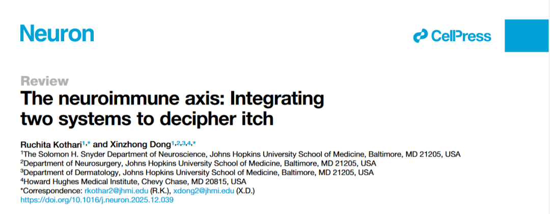 2026年4月15日,最新发表在国际顶刊Neuron上的综述《The neuroimmune axis: Integrating two systems to decipher itch》,直接颠覆认知:瘙痒,根本不是皮肤单独在闹脾气,而是神经系统和免疫系统互作失控的结果。这篇由约翰・霍普金斯大学团队撰写的权威综述,耗时多年整合全球研究,把 “痒”的底层逻辑彻底讲透:为什么你会痒?为什么痒起来停不下?未来怎么根治?
