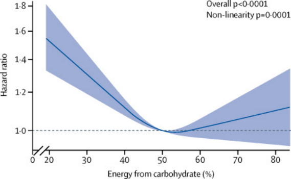 U字型曲线 Energy from carbohydrate(%)是指碳水化合物的能量占比;Hazard ratio 是指风险比。