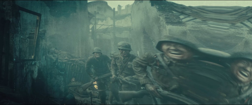 在刻画八十七旅白家宅一战时,棉花地里,几乎没有惨烈的肉搏特写。密集的枪声中,只见鲜红的血不断飞溅在雪白的棉花上;微距镜头下,绿叶上的螳螂与蚂蚁依然遵循着自然的法则。
