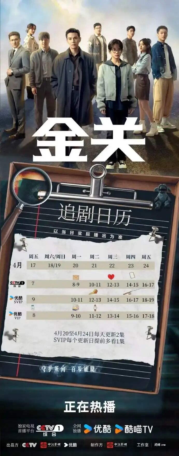 国内首部海关旅检题材电视剧《金关》于4月14日总台央视综合频道(CCTV-1)黄金档、优酷同步开播,目前正在热播中。4月16日,《金关》公布第二周追剧日历,4月20日至4月24日每天更新两集,优酷SVIP每个更新日提前看一集。该剧由中央电视台、深圳市中汇影视文化科技股份有限公司、优酷联合出品,深圳市中汇影视文化科技股份有限公司制作。