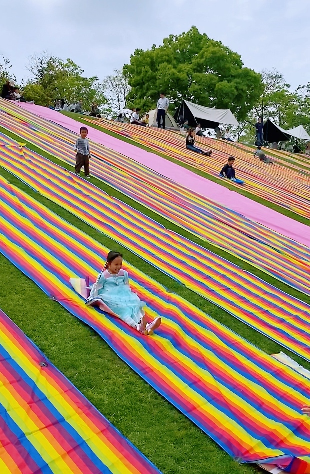 网红滑草坡人气有多高?4月18日中午,记者在现场看到,面向浦星公路一侧,这里已被数百条彩虹色的滑草布铺满,有的布还未完全铺好,心急的孩子们已经“哧溜哧溜”滑起来。五颜六色的帐篷和气球分布在草坪各处,场面颇为壮观。