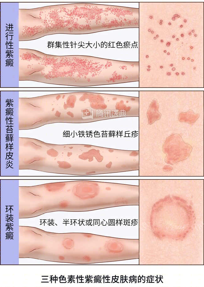 色素性紫癜性皮肤病表现为密集成片、胡椒面样的小瘀点,主要发生在四肢,尤其是下肢。