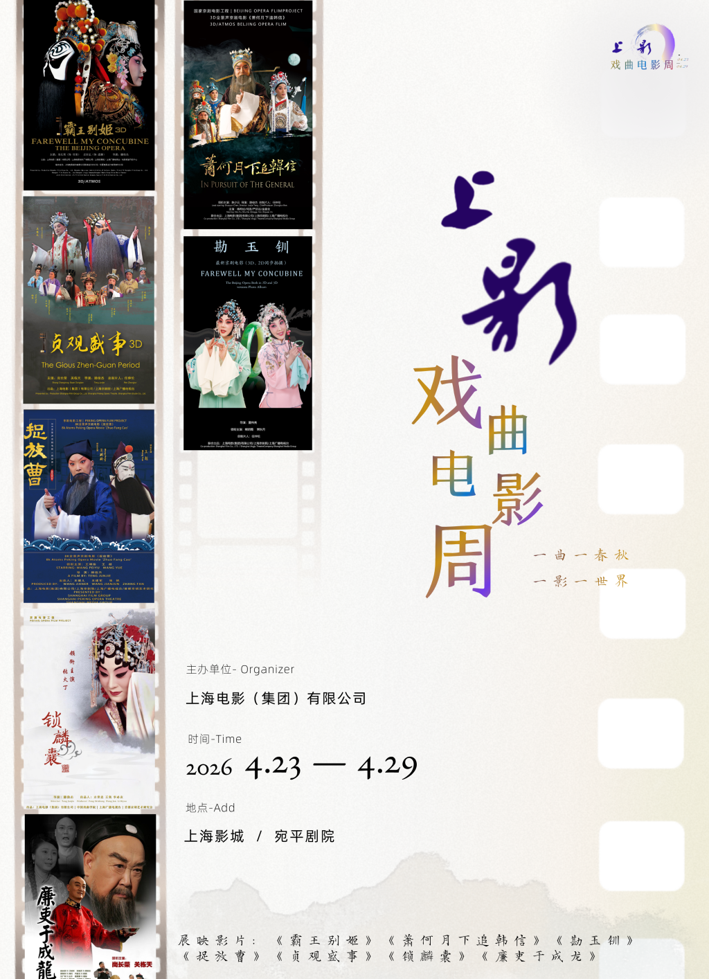 本届电影周精心遴选上影集团出品的7部优秀京剧电影集中展映,包括荣获金鸡奖最佳戏曲片的经典之作《贞观盛事》、《廉吏于成龙》及京剧艺术巅峰之作《锁麟囊》、《捉放曹》、《霸王别姬》、《勘玉钏》、《萧何月下追韩信》。通过“经典+新锐”、“传统+科技”的策展思路,电影周旨在打造沉浸式的戏曲光影空间,解锁国粹艺术的当代表达,为观众献上一场高水准的东方美学视听盛宴,并为戏曲电影这一国家级非遗项目提供高规格、有温度的展示与传播平台。