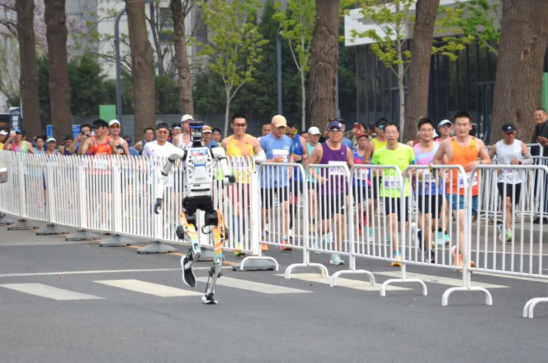 早上7时30分,人形机器人和跑者在起点同时鸣枪起跑,中间由隔离带安全分隔,一起参加21.0975公里的半程马拉松比赛。