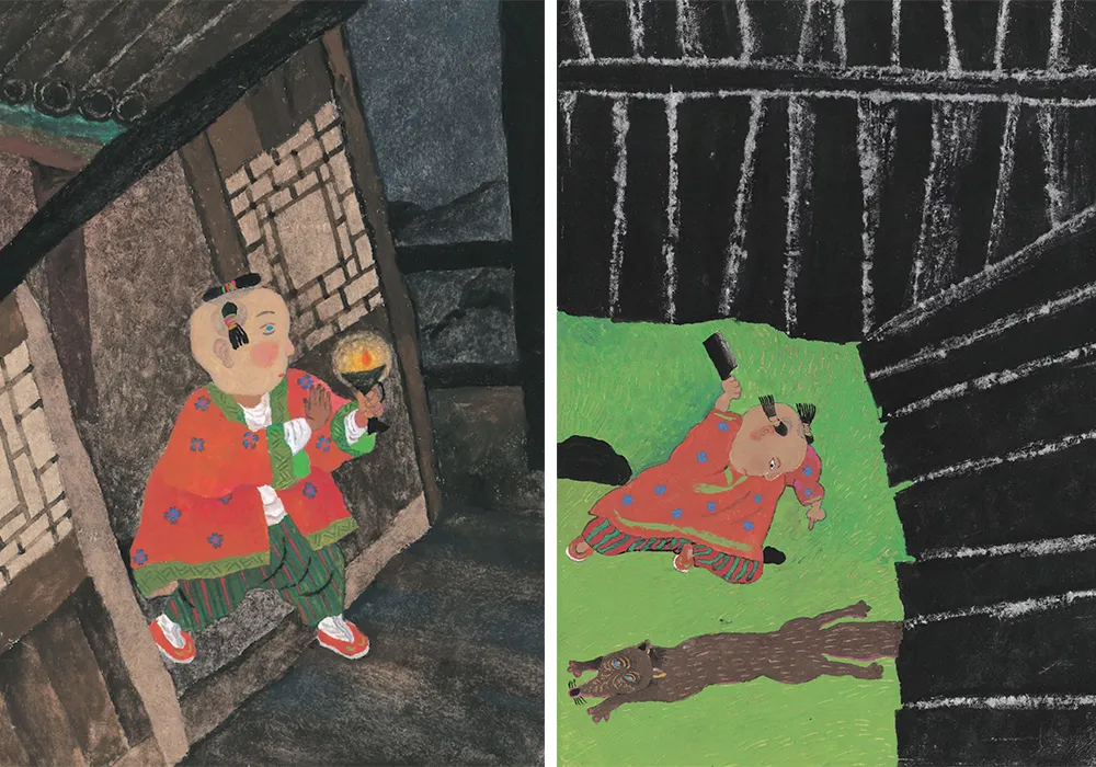 她画的《荒野狐精》,改编自蒲松龄的《聊斋志异》,讲述一个孩子凭借自己的智慧和勇气猎狐妖、救母亲的故事。作品以强烈的红与黑设色营造悬疑感,在牢牢吸引孩子目光的同时,也传达出勇敢坚毅的中国精神。