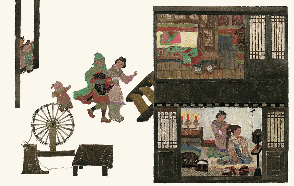 她画《花木兰》,并未刻板地塑造女英雄的单一形象,而是选取了更细腻的视角进行诠释。“人们的印象里,总是要把花木兰画成武将模样。我不要,我要她是美丽的,善良的。她本就是一个朴素的女孩子,喜欢她原本的生活,喜欢她的女性身份,所以愿意去保护家人,赢了后也更想要回家。”
