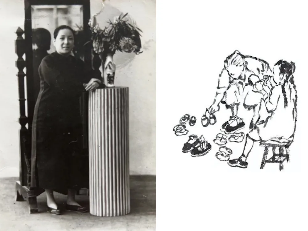 蔡皋的外婆和蔡皋根据回忆所画的“帮外婆纳鞋底”