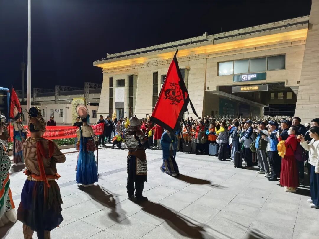 当晚,随着专列平稳抵达敦煌火车站,一场独具敦煌特色的迎客盛典温情启幕。阳关将军盛装主礼,高声宣礼:“阳关已开,沙州迎客!千年敦煌恭迎诸位丝路旅人!” ;金刚力士分列两侧威严护关;飞天仙子衣袂翩跹,乐舞悠扬。张骞、张议潮、壁画供养人等敦煌历史人物依次登场,共致“敦煌欢迎您”的诚挚问候。整场迎宾仪式气势恢宏、古韵绵长,以极具敦煌辨识度的文化礼遇,热情迎接首趟旅游专列宾客。游客们纷纷驻足观赏、拍照留念,对这场诚意满满、特色鲜明的沉浸式迎宾盛礼赞不绝口。