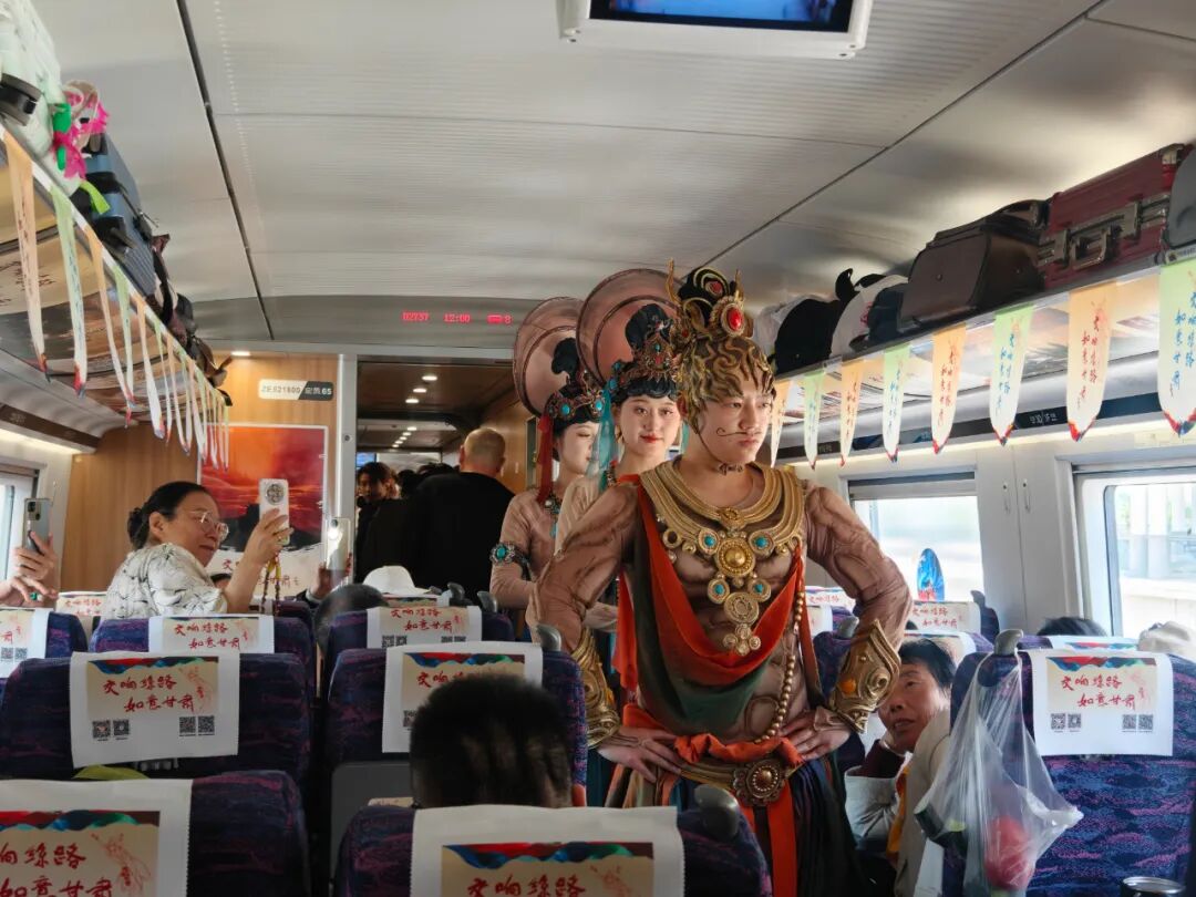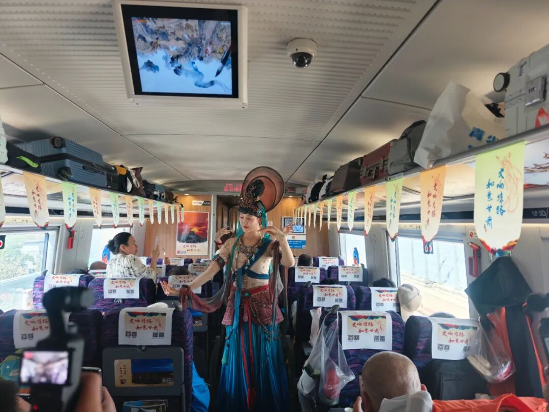 随着“交响丝路・如意甘肃”品牌冠名列车启动,敦煌主题车厢顺利盛装启程。敦煌市按照省文旅厅统一部署,组织文旅推介官、专业演艺人员及本地优质文旅企业全程参与车厢宣传互动活动。敦煌飞天、怒目金刚等敦煌壁画经典角色走进主题车厢,为客人带来沉浸式实景演艺;文旅推介官生动推介敦煌核心文旅资源,工作人员现场发放宣传资料、细致解答游客咨询,以赠送敦煌文创礼品及“甘” 味农产品等形式,让旅客在行进中感受敦煌魅力,车厢内氛围热烈、掌声不断。