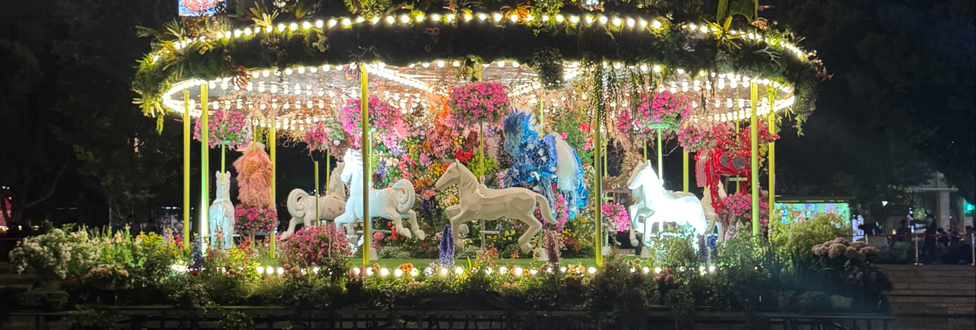 夜幕降临,灯光亮起,上海新天地太平湖中央的旋转木马缓缓转动,在平静的水面上映出倒影。几乎每一位路过的市民游客都忍不住用镜头记录下了这一场景。“是很梦幻又很浪漫,有人文气息的感觉。”一名游客赏花行至此处时不禁感叹。