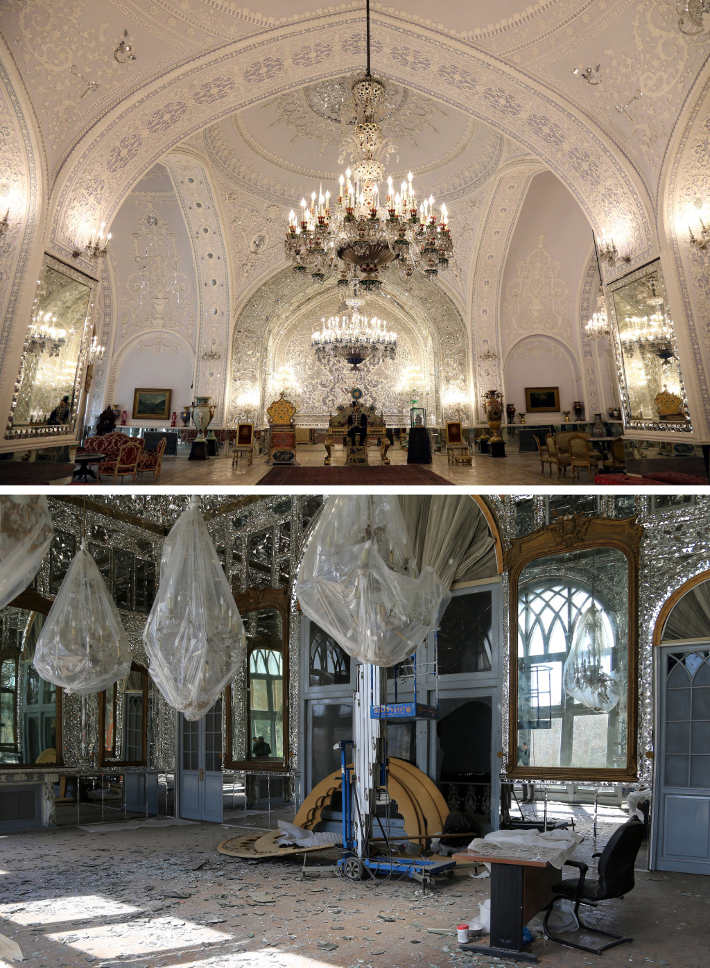 上图为2022年12月12日在伊朗首都德黑兰拍摄的古莱斯坦宫(新华社记者 沙达提 摄),下图为2026年3月3日在德黑兰拍摄的在空袭中受损的古莱斯坦宫(新华社 图)。