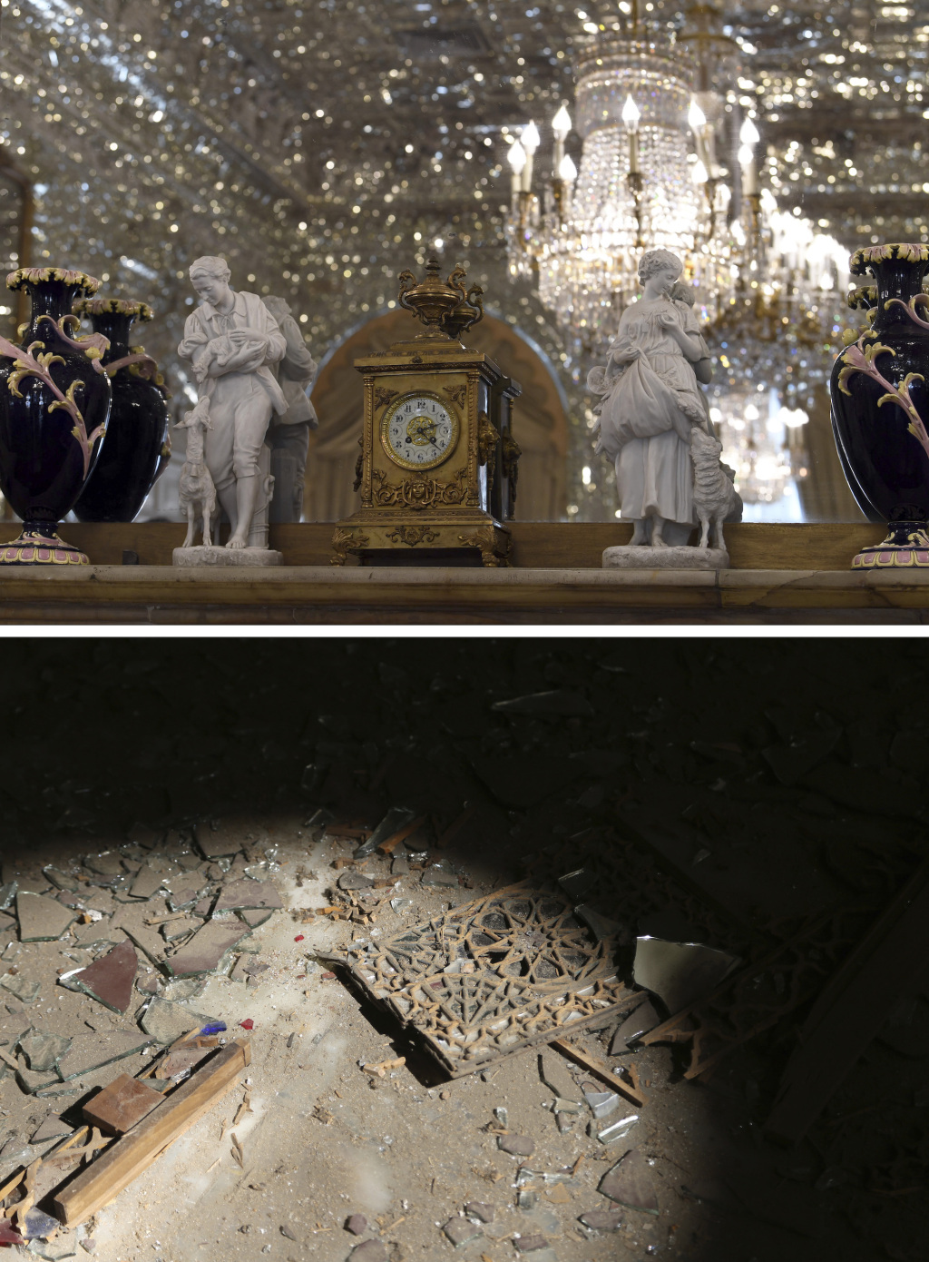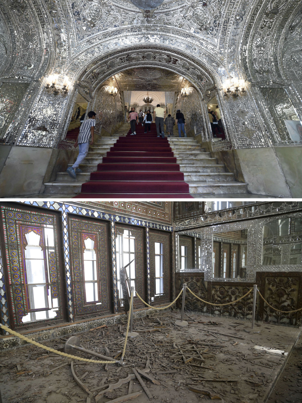 上图为2023年8月27日在伊朗首都德黑兰拍摄的古莱斯坦宫(新华社记者 沙达提 摄),下图为2026年3月3日在德黑兰拍摄的在空袭中受损的古莱斯坦宫(新华社 图)。