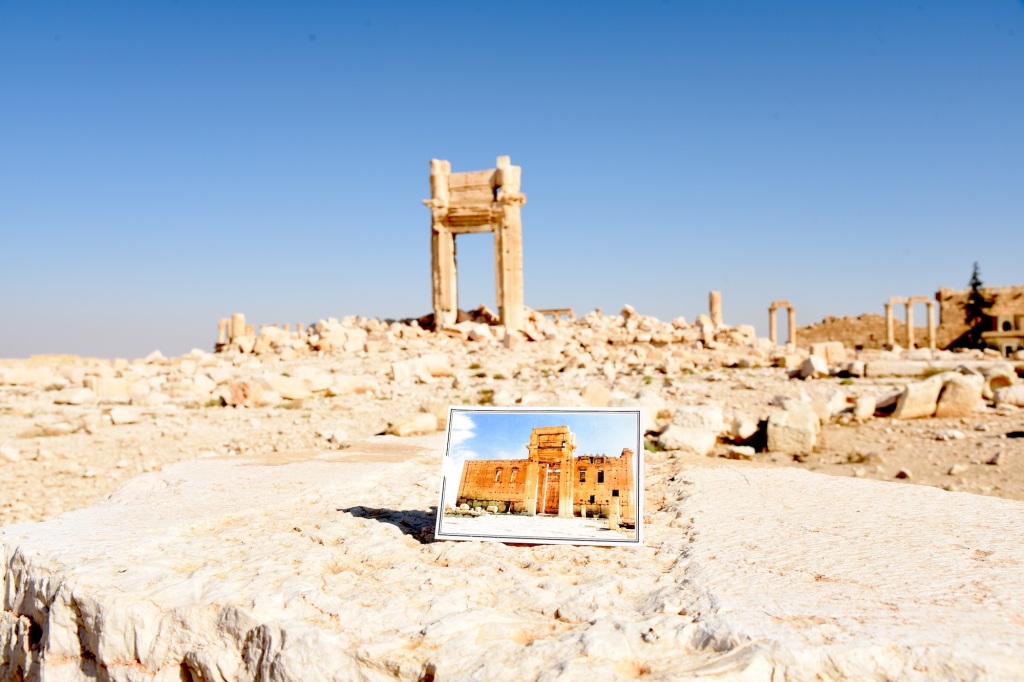 2026年4月18日,一张2024年11月13日拍摄的老照片被放置在叙利亚帕尔米拉古城遗址废墟前,对比可见该遗址受到的巨大破坏。新华社 图
