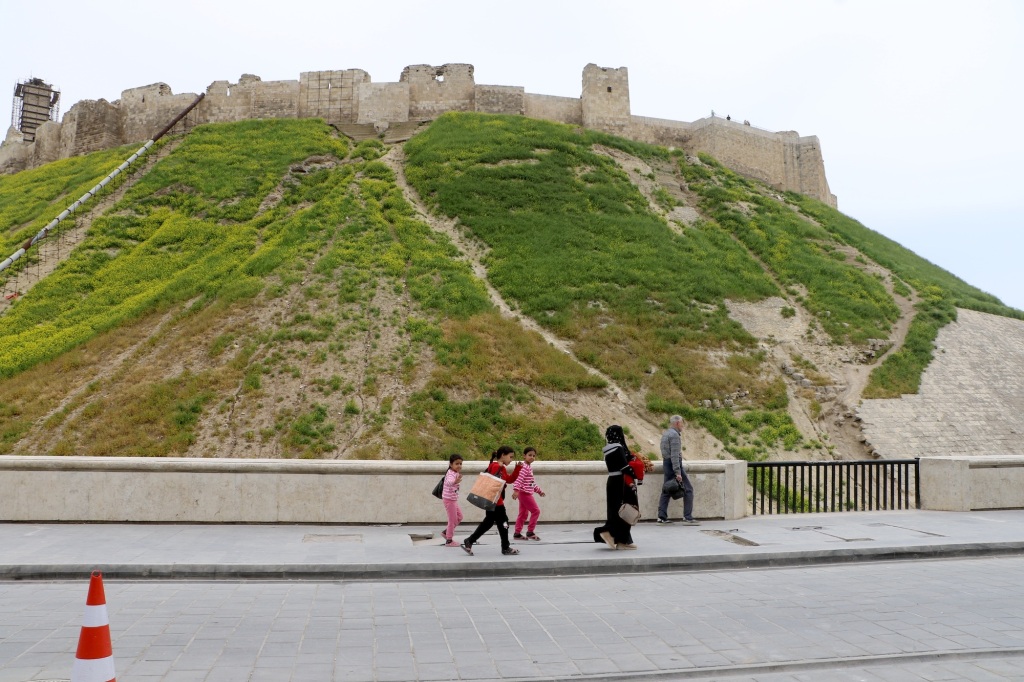 2026年4月16日,人们走过叙利亚阿勒颇城堡。作为阿勒颇古城的一部分,它于1986年被联合国教科文组织列入世界遗产名录。