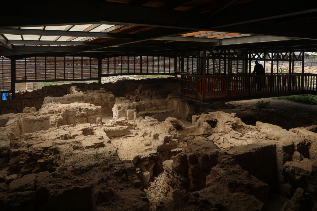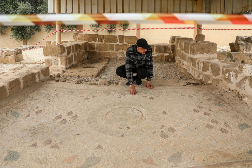 2026年4月15日,在巴勒斯坦加沙地带的圣希拉里翁修道院/特尔乌姆阿迈尔遗址,工作人员介绍遗址概况。