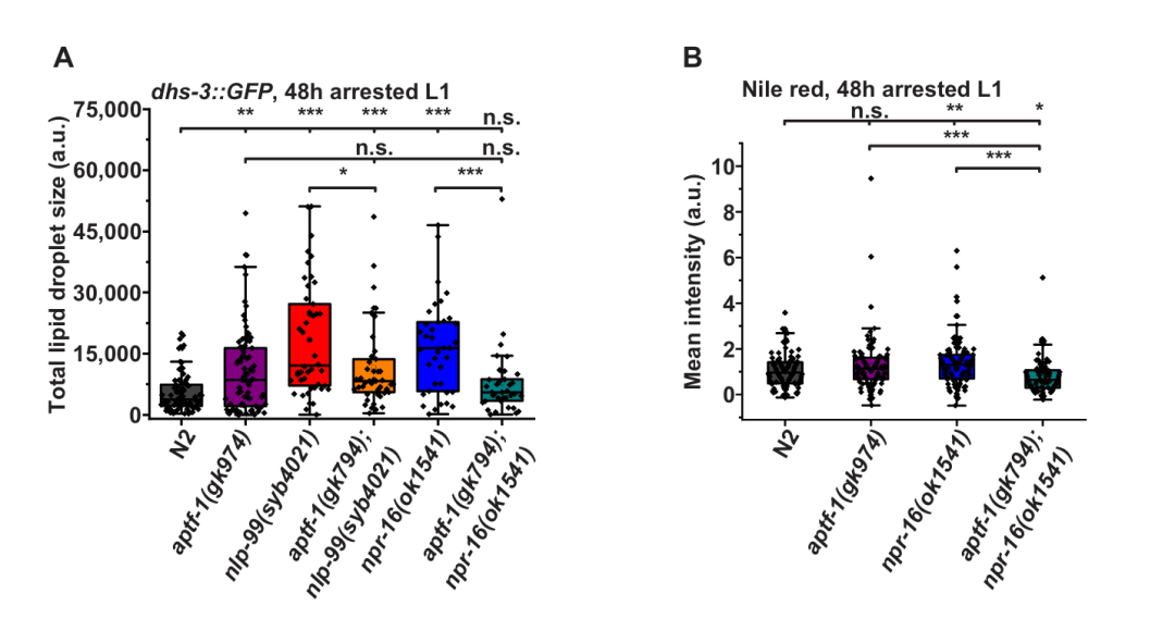 借助脂质染色、存活与寿命实验发现,NLP‑99/NPR‑16 缺失使饥饿幼虫肠道脂质储存增加、L1 滞育存活提升约 15%,成虫寿命延长 1‑2 天,且该效应完全依赖 RIS。饥饿时 NPR‑16 经 RIS 抑制脂质积累,饱食时则独立于 RIS 调控脂质,说明生长抑素信号保守地限制合成代谢,而 RIS 是其调控存活与寿命的关键中介。