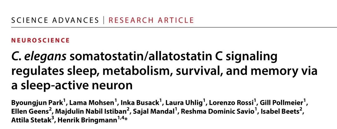 来自德国德累斯顿工业大学Henrik Bringmann教授团队做了一项专门研究,标题为《C. elegans somatostatin/allatostatin C signaling regulates sleep, metabolism, survival, and memory via a sleep-active neuron 》,相关成果于2026年4月16日发表在《Science Advances》期刊上。