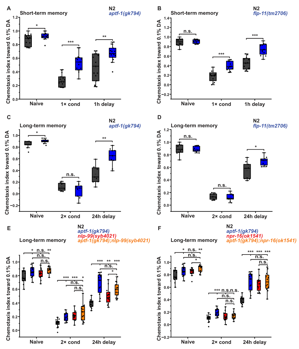 采用嗅觉学习与记忆检测,发现 RIS 功能缺失(aptf‑1/flp‑11 突变)会导致短期与长期记忆受损;NLP‑99 或 NPR‑16 缺失同样造成长期记忆巩固障碍。二者处于同一通路,均通过 RIS 与睡眠参与记忆形成,证实睡眠神经元是生长抑素信号调控记忆的核心节点,睡好了,才能记得住。