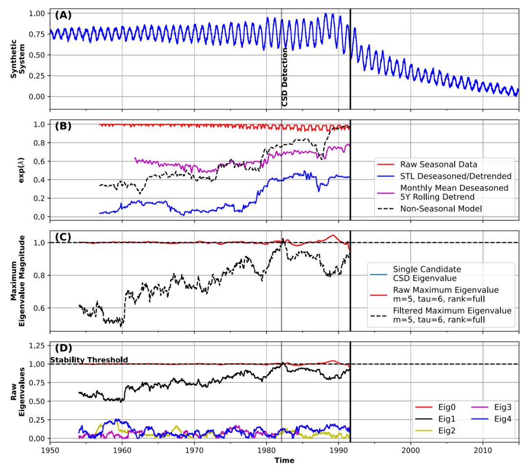 在实际操作中,研究者会面对一组特征值。其中总有一个或多个模长接近1的特征值,它们代表了系统稳定的季节性周期。而我们需要关注的,是那些模长在逐渐增大、并向1逼近的“非季节性”特征值。正是这些“不安分”的特征值,预示着系统内在恢复力的丧失和临界点的迫近。通过这种方式,方法成功地将周期信号和临界信号分离开来,避免了传统方法中因去除季节性而引入的偏差。