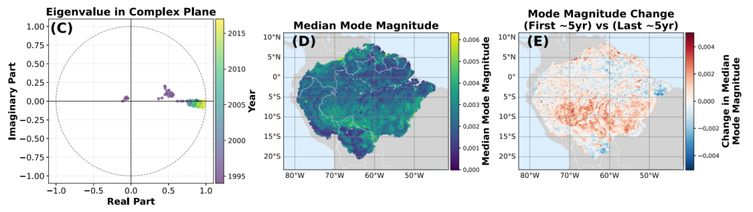 通过分析该特征值对应的空间模态,研究者能够清晰地指出,整个亚马逊地区的不稳定性主要集中在南部地区。这片区域正是过去几十年里森林砍伐最为严重的地区,人类活动的影响也最为突出。研究进一步发现,这一不稳定性模式与森林覆盖变化、人类足迹指数、火灾频率、降水以及干旱指数等多种驱动因素都存在复杂的空间关联,这表明雨林的不稳定性是多种因素在不同时空尺度上共同作用的结果。这种方法不再依赖于对成千上万个独立像素点的时间序列进行“点对点”的预警信号分析,而是直接从系统的时空演替中提取出最具决定性的不稳定性模式。