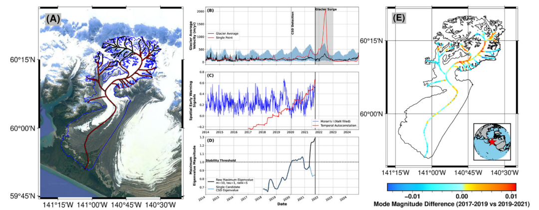 论文进一步指出,仅分析冰川上单个点的数据,其预警信号的强弱和时机很大程度上依赖于观测点的选择,这无疑引入了主观性。为此,研究者将分析对象从单个点扩展到整个冰川的面。他们将冰川表面数百个点的速度场数据,构建成一个时空数据立方体,并运用相同的动态模态分解框架进行分析。这时,整个冰川作为一个相干系统,其整体的稳定性变化被揭示出来。结果显示,对全冰川的分析能提供更稳定、更可靠的预警信号。更重要的是,通过分析动态模态分解输出的空间模态,研究者能够可视化出是冰川的哪些区域正在“蠢蠢欲动”,驱动着整个系统走向不稳定。这些区域往往是局部激活的,而非整个冰川均匀加速,这为理解冰川跃动的物理机制提供了宝贵的空间信息。