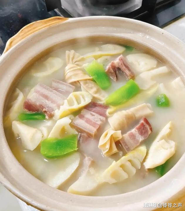 “笃”这个字太妙了,是吴侬软语里汤水滚沸的“咕嘟”声,不急不躁,温柔缠绵。听着这声音,你就知道锅里的三位主角正在悄悄“谈判”,咸肉的醇厚、鲜肉的丰腴、春笋的清甜,在汤水里慢慢交融、互相成就。最后喝到嘴里的那口汤,层次丰富到让人想哭,咸、鲜、甜完美平衡,一口下去,仿佛喝下了整个温柔又明媚的江南春。