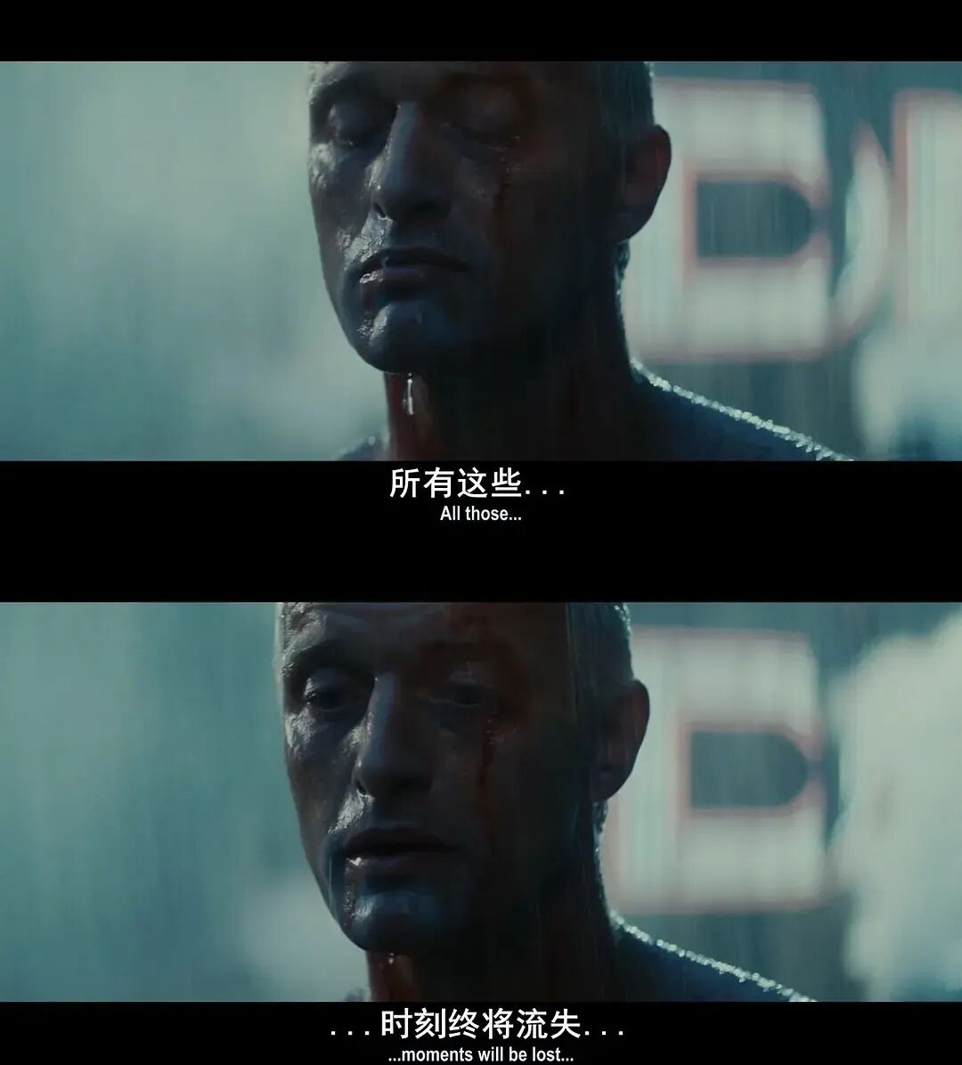 “所有这些时刻终将消失在时光中,一如眼泪消失在雨里。”(All those moments will be lost in time, like tears in rain.)