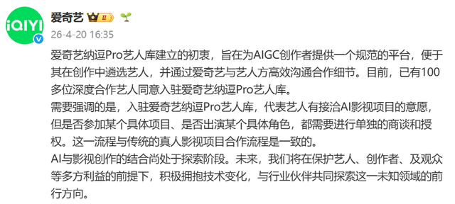 4月20日,针对“AI艺人库”方面的争议,爱奇艺官方回应称,爱奇艺纳逗Pro艺人库建立的初衷,旨在为AIGC创作者提供一个规范的平台,便于其在创作中遴选艺人,并通过爱奇艺与艺人方高效沟通合作细节。目前,已有100多位深度合作艺人同意入驻爱奇艺纳逗Pro艺人库。
