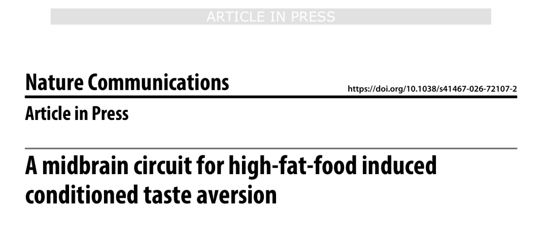 2026年4月18日,浙江大学脑科学与脑医学学院汪浩教授团队在《Nature Communications》上发表的研究《A midbrain circuit for high-fat-food induced conditioned taste aversion 》,揭开了这一问题的答案 :
