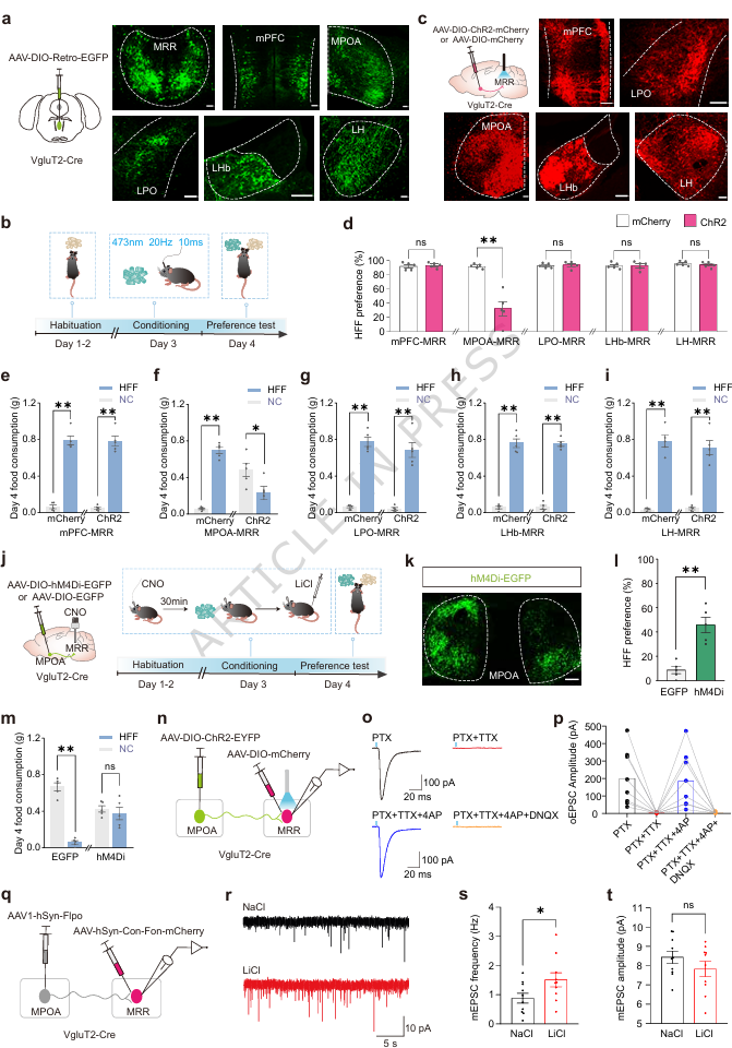 激活MPOA→MRR的谷氨酸能投射可以直接诱导出食物厌恶;抑制这条通路则厌恶记忆无法建立。膜片钳电生理证实,两者存在单突触连接,且厌恶形成后突触传递增强。