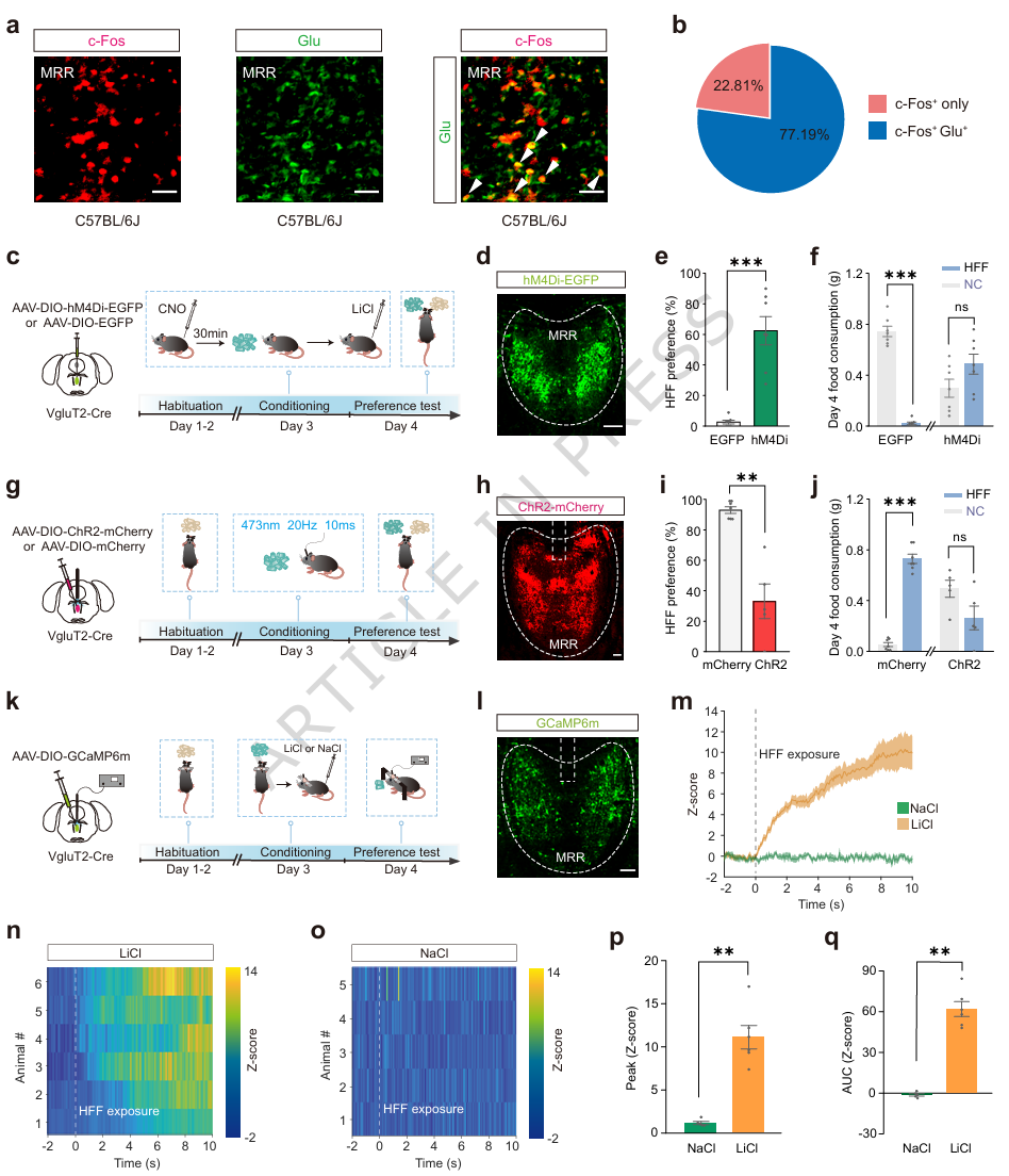 本研究以固态高脂食物为对象,构建条件味觉厌恶模型,锁定 MRR 谷氨酸能神经元为核心,阐明MPOA→MRR通路介导厌恶记忆形成、MRR→LHb通路介导记忆表达的完整环路,揭示了高热量食物厌恶学习的神经机制。