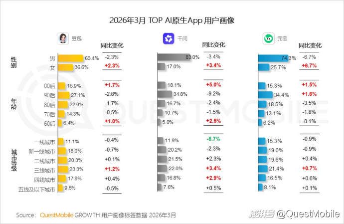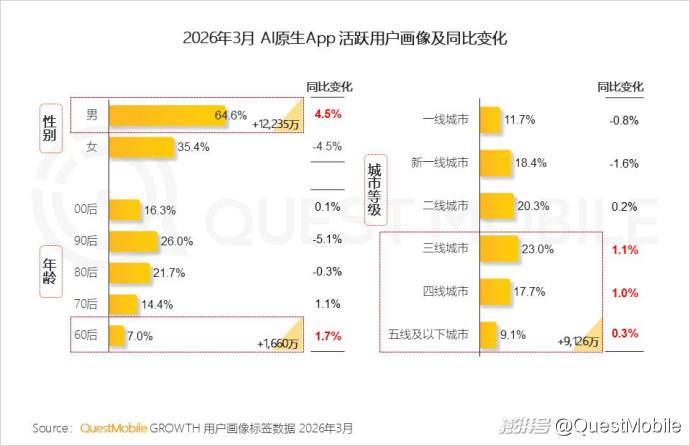 QuestMobile数据显示,截至今年3月,男性用户占比达64.6%,同比提升4.5%,用户规模增加1.2亿;60后及三线以下用户占比分别提升1.7%和2.4%,用户规模相应增加1660万和9126万。