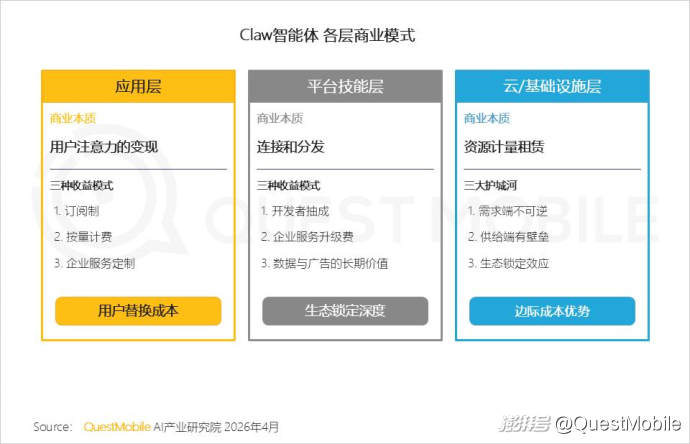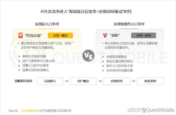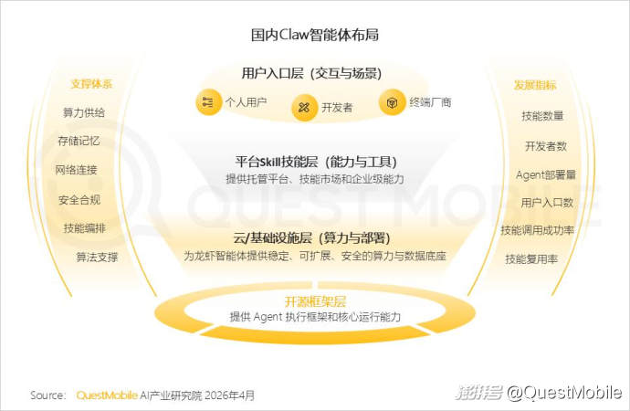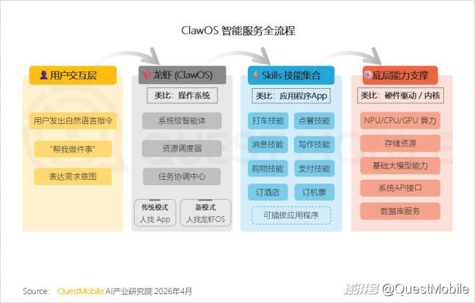 而“龙虾落地”又再度带来了新的变量:“龙虾”是“操作系统+应用商店”的架构模式,让手机厂商的OS与互联网企业的Skill的“竞合”走向新的阶段,“场景调用”与“生态规模”成为各家竞争的焦点,这与头部玩家用户规模、粘性之间又形成了新的承接关系……