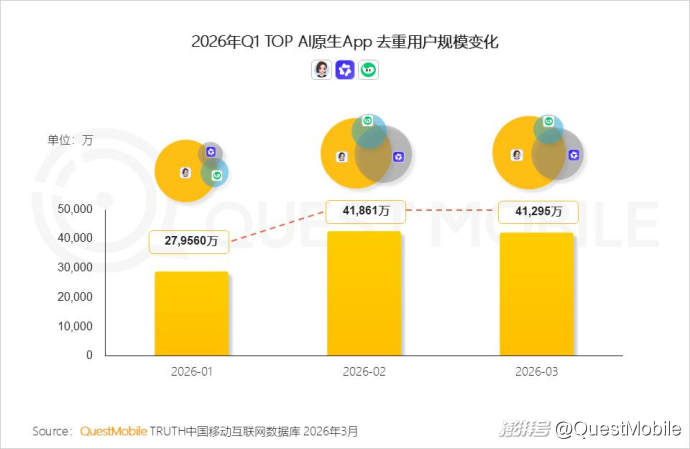 QuestMobile数据显示,2025年11月,AI原生App迈入加速爆发期,截至今年3月整体用户规模达4.46亿,较25年11月增长13495万,增速达43.4%。