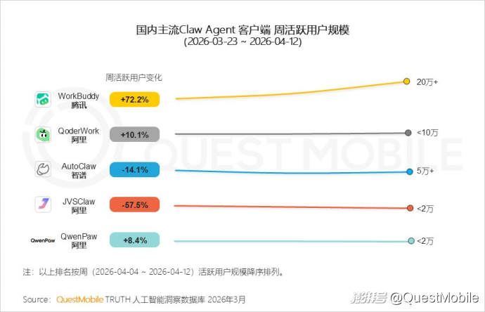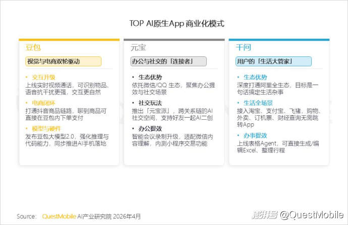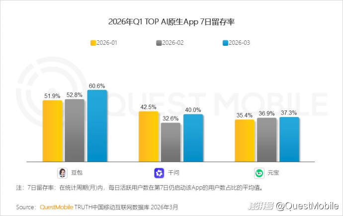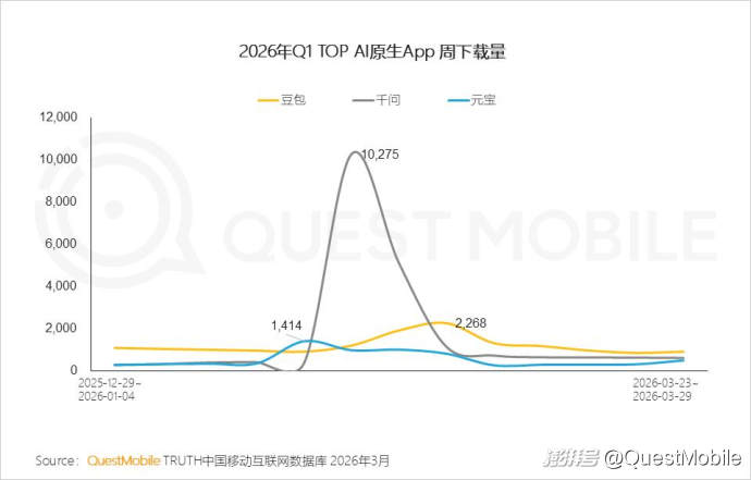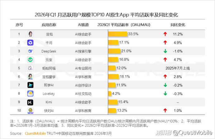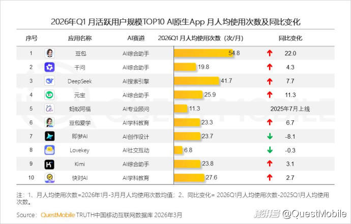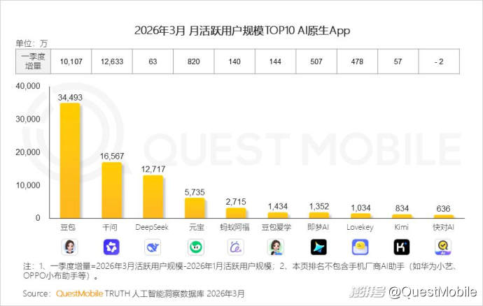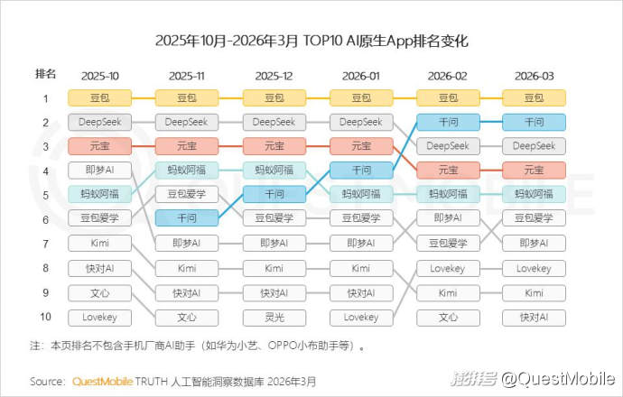 QuestMobile数据显示,一季度豆包活跃用户增加1亿,千问增加1.26亿,排名从25年11月的TOP6提升至TOP2。