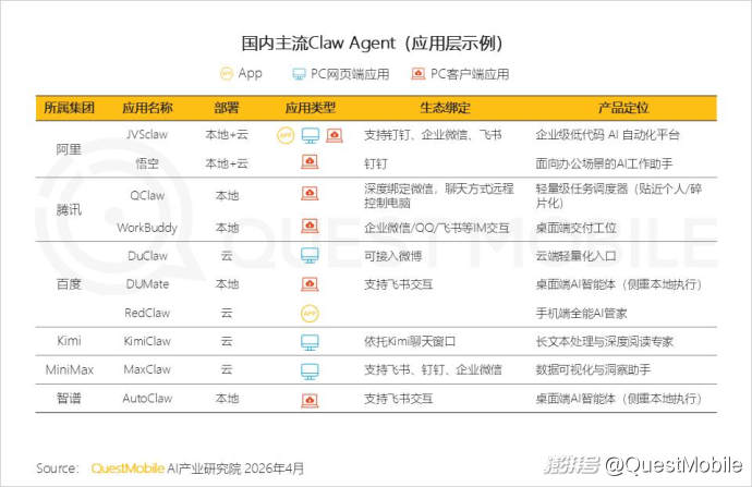 5、国内主流Claw Agent(应用层)呈现出清晰的“集团-产品-部署-场景”的四维映射,而生态的网络效应一旦被激活,将会呈指数级放大优势